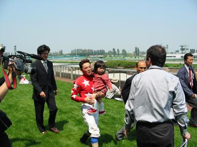 ・走り寄る愛娘を抱き上げて壮行会場に登場する五十嵐騎手