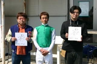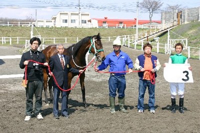 第3回 優勝馬との写真撮影体験! 2007.05.03 5月3日、第3回「優勝馬との写真撮影体験!」が門別競馬場で行われ、一般ファン2名が写真撮影を体験しました。 参加したのは、東京都の松橋標樹さんと、札幌市の内藤綱正さん。 2名は、第6レースの優勝馬サチコゴージャス、伊藤靖則調教師、竹内仁志騎手らと口取り写真撮影に参加し、撮影後にはサインをもらいました。 写真 上:優勝馬との記念写真 下:優勝した竹内騎手と記念撮影