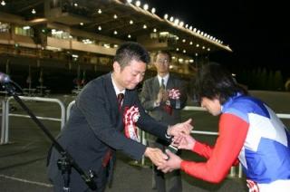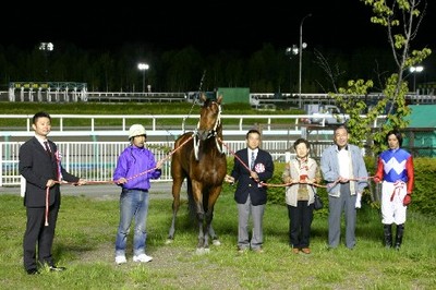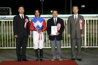 スタリオン競走表彰プレゼンター 2007.05.23 5月23日、旭川競馬場で新たなファンサービスの取り組みとして、(社)JBC協会協賛スタリオン競走の表彰式において一般ファンが表彰プレゼンターを務める『スタリオン競走表彰プレゼンター』が行われました。 第1回目は「シックスセンス賞」で旭川市内の竹内一浩さんがプレゼンターを務め、佐藤英明調教師(馬主代理)、馬渕繁治騎手に記念品を贈呈しました。 写真 上:口取り写真 中:騎手に記念トロフィーを贈呈 下:関係者と記念撮影