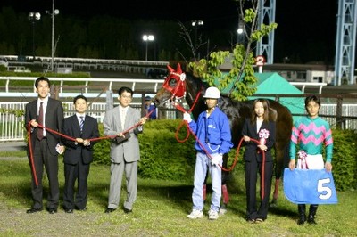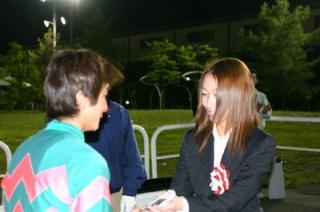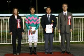 第4回目は「スターリングローズ賞」で、旭川市の国部りえさんがプレゼンターを務め、優勝馬マチカネアオイの廣森調教師(馬主代理)、川島洋人騎手に記念品を贈呈しました。