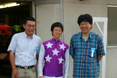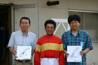 2名は実況放送室で古川アナウンサーと競馬ブックの高倉記者が担当したパドック解説とレース実況を観戦し、また、検量室では井上俊彦騎手・岩橋勇二騎手と記念撮影をしました。