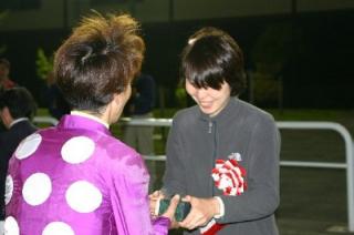 第11回目は「エアエミネム賞」で、兵庫県のファンがプレゼンターを務め、優勝馬シェレルダンサーの林正夫調教師(馬主代理)、櫻井拓章騎手に記念品を贈呈しました。
