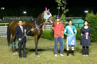第18回目は「イーグルカフェ賞」で、大阪府のファンがプレゼンターを務め、優勝馬アーペレーヌの米川昇調教師(馬主代理)と川島雅人騎手にそれぞれ記念品を贈呈しました。