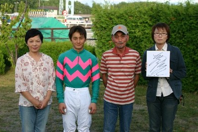 3名は、第7レースの優勝馬ペブルスショウリ、川島洋人騎手らと口取り写真に参加し、撮影後にはサインをもらい記念撮影をしました。