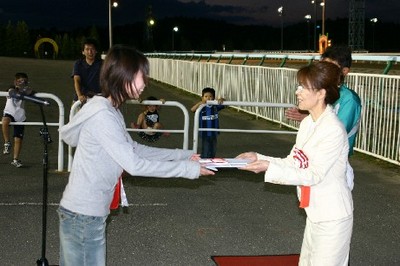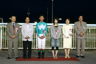 第23回 スタリオン競走表彰プレゼンター 2007.07.31 7月31日、旭川競馬場で「第23回 スタリオン競走表彰プレゼンター」が行われました。 第23回目は「アルカセット賞」で、札幌市のファンがプレゼンターを務め、優勝馬ブライトフェースの馬主 木谷様と齊藤正弘騎手にそれぞれ記念品を贈呈しました。 また、プレゼンターには、ダーレー・ジャパン株式会社から提供されたダーレーグッズが贈られました。 写真 上:馬主へ目録贈呈 中:関係者との記念撮影 下:ダーレーグッズを手に齊藤正弘騎手と記念撮影