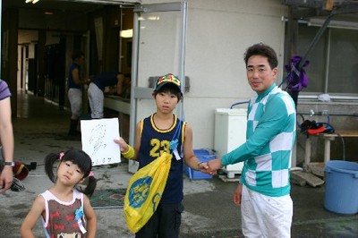 上:宮崎騎手からサインをもらい、笑顔で握手