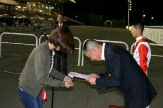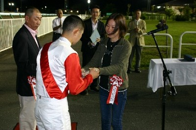 第30回 スタリオン競走表彰プレゼンター 2007.09.04 第30回目は「テイエムオペラオー賞」で、兵庫県のファンがプレゼンターを務め、優勝馬サクラヴェローチェの林和弘調教師(馬主代理)と佐々木国明騎手にそれぞれ記念品を贈呈しました。 また、プレゼンターには、日高軽種馬農業協同組合から提供された「種牡馬パンフレット」が贈られました。 写真 上:林和弘調教師へ目録贈呈 中:佐々木騎手へトロフィー贈呈 下:サインをもらい、記念撮影