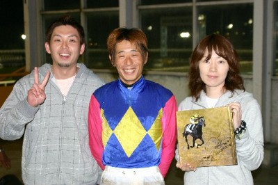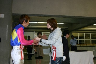 第32回目は「トウカイテイオー賞」で、神奈川県のファンがプレゼンターを務め、優勝馬ピエールバスターの堂山調教師(馬主代理)と服部騎手にそれぞれ記念品を贈呈しました。