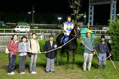 第35回 スタリオン競走表彰プレゼンター 2007.09.19 9月19日、旭川競馬場で「第35回 スタリオン競走表彰プレゼンター」が行われました。 第35回目は「スウェプトオーヴァーボード賞」で、深川市のファンがプレゼンターを務め、優勝馬マイレディーキセキの林正夫調教師(馬主代理)と服部騎手にそれぞれ記念品を贈呈しました。 また、プレゼンターには、社台スタリオンステーションから提供された「種牡馬パンフレット」が贈られました。 写真 上:優勝馬マイレディーキセキと口取り写真 中:林正夫調教師へ目録贈呈 下:「種牡馬パンフレット」と「サイン」をもらい記念撮影