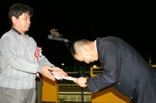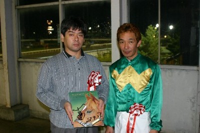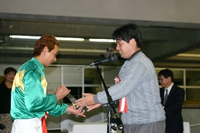 第38回 スタリオン競走表彰プレゼンター 2007.09.27 9月27日、旭川競馬場で「第38回 スタリオン競走表彰プレゼンター」が行われました。 第38回目は「ツルマルボーイ賞」で、兵庫県のファンがプレゼンターを務め、優勝馬ナリタキセキボーイの林和弘調教師(馬主代理)と山口騎手にそれぞれ記念品を贈呈しました。 また、プレゼンターには、(株)ジェイエスから提供された「種牡馬パンフレット」が贈られました。 写真 上:林和弘調教師へ目録贈呈 中:山口騎手へトロフィー贈呈 下:山口騎手と記念撮影