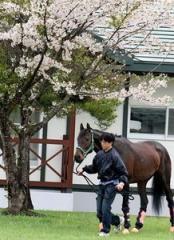 写真 静内種馬場を榎並厩務員と出発するコスモバルク