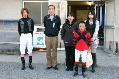 第8回 実況放送室・検量室観戦ツアー 2008.06.25 6月25日、旭川競馬場において、「第8回 実況放送室・検量室観戦ツアー」 が行われ、旭川市と札幌市のファン3名が見学しました。 3名は実況放送室で古川アナウンサーと競馬ブックの高倉記者が担当した第8 レースのパドック解説を見学、その後、検量室では伊藤千尋騎手、黒澤愛斗騎手 と記念撮影し、サインをもらいました。 写真 上:実況放送室で記念撮影 下:伊藤千尋騎手、黒澤愛斗騎手と記念撮影