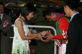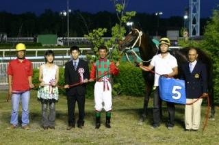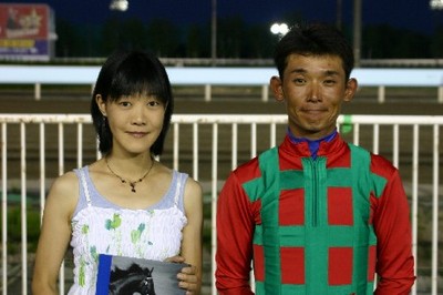 第15回 スタリオン競走表彰プレゼンター 2008.07.08 7月8日、旭川競馬場で第15回「スタリオン競走表彰プレゼンター」が行われま した。 第15回目は「アルカセット賞」で、埼玉県のファンがプレゼンターを務め、優勝 馬の馬主 (有)ビッグレッドファームと齊藤正弘騎手にそれぞれ記念品を贈呈しま した。 また、プレゼンターには、ダーレー・ジャパン(株)から提供された『スタリオン ブック』等が贈られました。 写真 上:優勝馬イグゼキュティヴと口取り写真 中:齊藤正弘騎手へ記念品贈呈 下:齊藤正弘騎手と記念写真