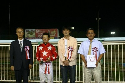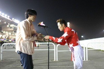 第30回目は「サウスヴィグラス賞」で大阪府のファンがプレゼンターを務め、優勝馬ラブストレングス号の村上調教師(馬主代理)と五十嵐冬樹騎手にそれぞれ記念品を贈呈しました。