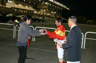 優勝馬モエレソーブラッズ号の堂山芳則調教師(馬主代理)と井上俊彦騎手にそれぞれ記念品を贈呈しました。