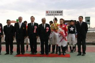 五十嵐冬樹騎手 1300勝達成表彰式 2008.10.28 10月28日、旭川競馬場で10月9日に1300勝を達成した五十嵐冬樹騎手(桑原義光厩舎)の表彰式が門別競馬場スタンド正面パドックで行われ、多くのファンや関係者の祝福を受けました。 表彰式終了後には、五十嵐冬樹騎手から集まったファンに花束がプレゼントされました。 また、小林靖幸騎手がプラカード持ちを務めてくれました。 写真 上:北海道調騎会から花束の贈呈 下:参加者全員で記念写真