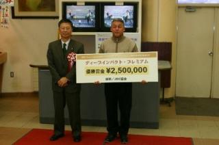 『ディープインパクト・プレミアムⅣ』実施! 2008.11.19 11月19日、門別競馬第10競走で、スタリオン・プレミアムシリーズ『ディープインパクト・プレミアムⅣ』を実施しました。 このレースでは、小国博行騎手騎乗のモエレアドミラル号が勝利し、堂山芳則調教師(馬主代理)へ1着賞金250万円を贈呈しました。 写真 賞金パネルを手に記念撮影