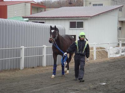 3月6日(金)午前9:30、門別競馬場堂山芳則厩舎内にて、額がハートマークのマサノウイズキッド号(サラ牡3歳)が、美浦の小島茂之厩舎へ向けて出発しました。当日の天候は、曇りで風の強い天候のなかでしたが、元気な姿を見せてくれました。