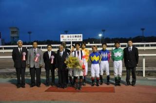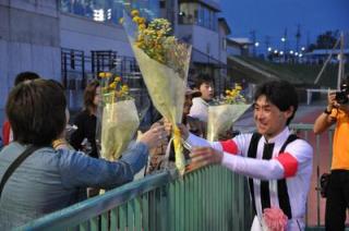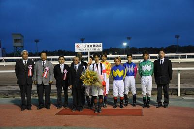 小嶋久輝騎手 800勝達成表彰式 2009.08.12 8月12日(水)、門別競馬場で8月11日(火)第4レースバンブーレブルー号に騎乗し通算800勝を達成した小嶋久輝騎手(堂山芳則厩舎)の表彰式がウイナーズサークルで行われ、多くのファンや関係者の祝福を受けました。 表彰式終了後には、集まったファンに花束がプレゼントされました。 (プラカード 岩橋勇二騎手)