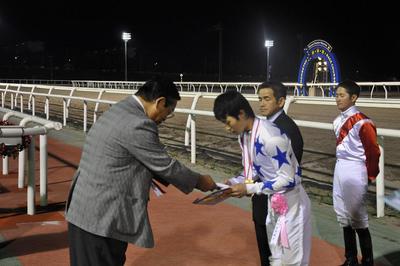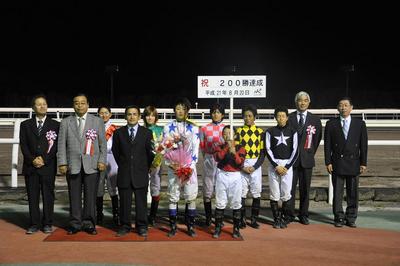 8月25日(火)、門別競馬場で8月20日(木) 第7レースミッドナイトボーイ号に騎乗し通算200勝を達成した桑村真明騎手(角川秀樹厩舎)の表彰式がウイナーズサークルで行われ、多くのファンの方々や関係者の皆様の祝福をいただきました。