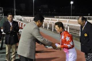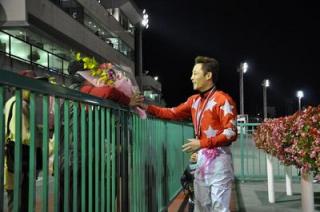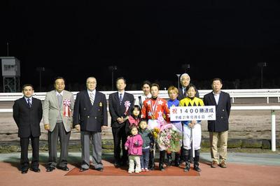 五十嵐冬樹騎手 1,400勝達成表彰式 2009.10.07 10月7日(水)、門別競馬場で昨日の第8レースモエレナターシャ号に騎乗し、1,400勝を達成した五十嵐冬樹騎手(桑原義光厩舎)の表彰式がウイナーズサークルで行われ、ファンの方々や関係者の皆様の祝福をいただきました。表彰式終了後には、五十嵐冬樹騎手から集まったファンに花束がプレゼントされました。 (プラカード 沼澤英知騎手)