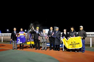 11月4日(木)、農林水産大臣賞典 道新スポーツ杯 第37回北海道2歳優駿(JpnⅢ)[ダイワメジャー賞]が行われ、宮崎光行騎手騎乗のカネマサコンコルド号(北海道)が内々をロスなく立ち回り、直線では鋭く伸びて2着ビッグロマンス号(JRA)に1/2差をつけて優勝しました(1.55.3)。