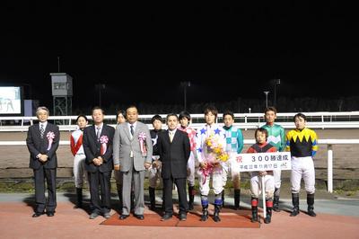 桑村 真明 騎手 300勝達成表彰式 2010.11.18 11月17日(水)、第7レースサルサデラルス号に騎乗し、中央・地方通算300勝を達成した桑村真明騎手(角川秀樹厩舎)の表彰式が11月18日(木)第9競走終了後、ウイナーズサークルで行われ、ファンの方々や関係者の皆様の祝福をいただきました。
