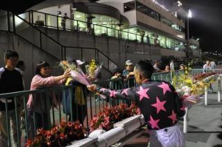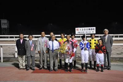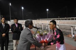 7月21日(木)第10レースサクラヴィヴィアン号に騎乗し、地方・中央通算1,300達成した坂下秀樹騎手(原孝明厩舎)の表彰式が7月26日(火)第10競走終了後、ウイナーズサークルで行われました。