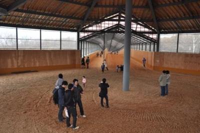 みんなで見学!新設坂路コース体験ウオーク 2012.05.03 門別競馬場に新設された屋内坂路コースを自ら歩く「体験ウオーク」が実施され45名が参加し、 「ウッドチップがふかふかで気持ちがいい」、「施設がきれい」と新設坂路コースのウッドチップを踏みしめ 全長900m最大斜度5,5%を体験しました。