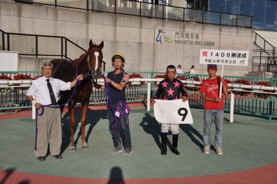 口取り写真では、実習生の井上幹太君がプラカードを持ってくれました。なお、1,400勝達成の表彰式は、10月10日(水)の第11競走本馬場入場後にウイナーズサークル(雨天時はスタンド)で実施予定です。