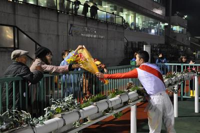 佐々木 国明騎手 800勝達成表彰式 2012.11.14 11月13日(火)、地方・中央通算800勝を達成した佐々木 国明騎手(若松 平厩舎)の表彰式が本日の第6競走終了後、ウイナーズサークルで行われました。