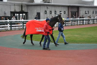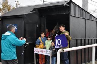 午後1時にパドックで元気な姿を見せてくれたコスモバルク。雨が降りしきる厳しいコンディションのなか、たくさんのお客様がバルクとの再会を果たしました。