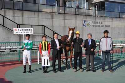 服部茂史騎手 1,200勝達成 2013.05.16 5月16日(木)、門別競馬 第4レースで服部茂史騎手(田中淳司厩舎)がダマスクインゴット号に騎乗し、平成6年のデビューから、11,300戦目で中央・地方通算1,200勝を達成しました(ホッカイドウ競馬では現役7人目 )。 服部 茂史騎手コメント 「多勝利を自厩舎の馬で勝ててよかったです。これも何かの巡り合わせですかね。」 口取り写真では、石川倭騎手がプラカードを持ってくれました。