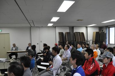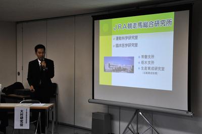今回の調査に携わった日本中央競馬会競走馬総合研究所の大村 一 研究役が講師を務め、「坂路調教コースにおける調教負担度の調査結果について」を報告。調教用として使用しているダートコースと坂路調教コースでの心拍数や乳酸値について、科学的なデータをもとに説明され、参加した調教師や騎手など厩舎関係者(約40名)からも坂路の調教方法などについての質問がありました。