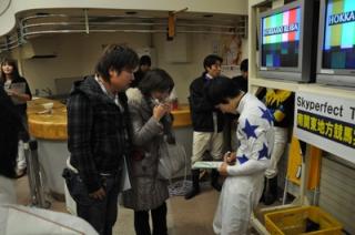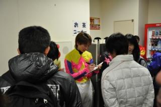 ファン感謝DAYイベントの実施(門別競馬場) 2013.11.14 本日、今年の最終日を迎えた門別競馬場では、開門と同時に多くのお客様にご来場いただき、来場者プレゼントとして、石狩鍋や競馬グッズが当たるファン感謝抽選会、売店による人気メニューが390円で提供されるサンキューイベントなどが門別競馬場で実施されました。最終レース終了後は、ホッカイドウ競馬のジョッキーとの交流会&サイン会が行われ、パティスリーパサパさんからのケーキを囲み大勢のファンの方々が交流を楽しみました。