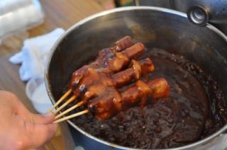 “室蘭やきとり”といえば、豚串のこと。また、ネギは長ネギではなくタマネギを使用し、洋がらしでいただくのが定番。「今昔」では、37年間継ぎ足しの肉の旨味が凝縮されたタレまた、マヨネーズ、カレーだれなど、独自のブレンドダレも使用します。