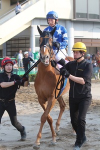 「馬体重の−6キロはまったく想定の範囲内で、加藤(暁海)厩務員がよく頑張ってくれました。仕上がりは良かったですし、攻め馬もできていて久々を感じさせない状態で臨めたのですが、とにかく1600mという「距離」ですね・・。敗因はそこに尽きると思います。昨年暮れの大井(東京2歳優駿牝馬SⅠ)と全く同じで、ラストは馬が苦しがってしまって手前も替えないまま走ってましたから。コーナーを4回まわるようなコースじゃなく、門別1200mみたくワンターン(3,4コーナーのみ)で走る距離で走らせてあげれば全然違った走りを見せてくれるでしょう。今回は残念でしたが、今日勝てなかったことによってJRAの特指では500万下を使えるので、この後はJRA函館競馬・開幕週の芝1200mに挑戦してみようと思っています。今日は応援いただき、ありがとうございました。」