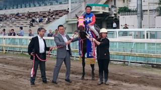 「直前でこの後の園田移籍が決まり、ウチの所属では最後のレースということでしたので勝って責任を果たすことができ、本当に良かったです。外枠で競馬しやすいところでしたので、戦前から2,3番手で思っていましたが、川原さんも上手に乗ってもらって、ほぼ思い描いた通りの競馬になりました。2着馬にいったん並ばれて少しヒヤッとはしましたけど、脚が残っていましたね。今まで門別でワンターンの競馬しか経験してなかったので、こういった小回りのコーナー4回の競馬になって「道中で変に息を抜いたりしなければ」とか心配もあったんですけど、そこらも含めて川原さんにしっかり乗ってもらえたと思いますね。今後は、園田の所属でグランダムの女王めざし頑張ってほしいです。今日は応援いただき、有難うございました。」