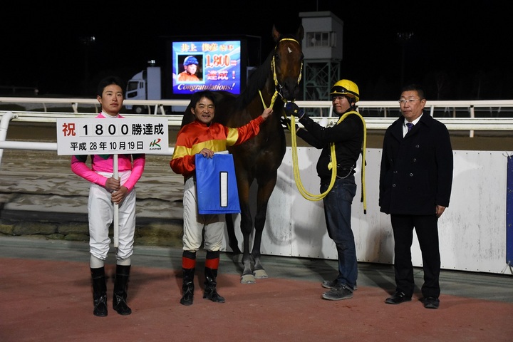 10月19日(水)、門別競馬 第10レースで井上 俊彦(いのうえ としひこ)騎手(林 和弘きゅう舎所属)がリーダーズ号に騎乗し、14,286戦目で地方・中央通算1,800勝を達成しました(ホッカイドウ競馬では現役3人目)。