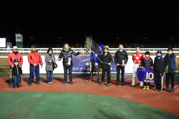 本年度ホッカイドウ競馬の最終競走、第60回 道営記念〔H1〕(スクリーンヒーロー賞)[ダート2,000m(外) 曇・不良]が行われ、3番人気ステージインパクト号が2着オヤコダカ号にアタマ差をつけて優勝しました(タイム:2.07.2)。