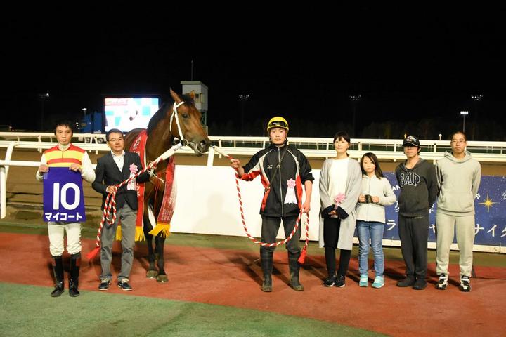 本日のメイン競走、大阪スポーツ杯 第18回 サンライズカップ〔H2〕(マクフィ賞)[ ダート1,800m(外) 曇・重 ]が行われ、7番人気マイコート号が2着ウィンターフェル号にハナ差をつけて優勝しました。(タイム:1.55.8)
