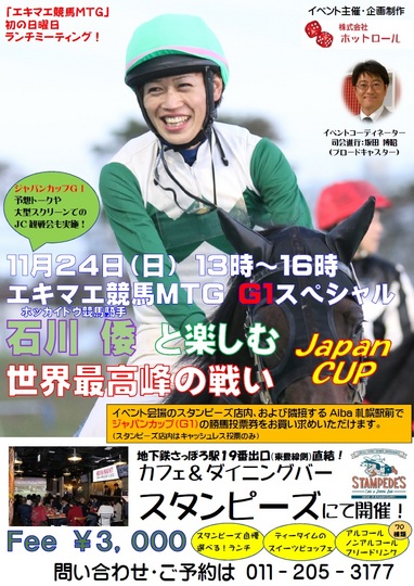 Aiba札幌駅前イベントについて(11月24日[日]) イベント 2019.11.12 Aiba札幌駅前において、11月24日(日)に実施される「エキマエ競馬MTG」に、石川倭騎手がゲストとして出演いたしますので、お近くの方はぜひ足をお運びください。 ※詳細につきましては、スタンピーズ(電話:011-205-3177)へお問い合わせください ※Aiba札幌駅前HPはこちらから