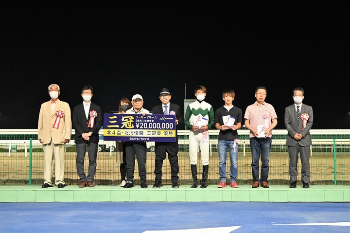 なお、同馬は本年の北斗盃・北海優駿(ダービー)に続く本競走の勝利でホッカイドウ競馬史上6頭目の3歳三冠達成となり、3歳馬三冠褒賞金2,000万円を獲得しました。