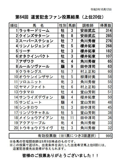 第64回 道営記念ファン投票結果(PDF)はこちらから