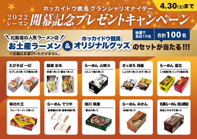 2022シーズン開幕を記念して「北海道ラーメンセットプレゼントキャンペーン」を実施いたします。北海道を代表するラーメンセットが、抽選で100名様に当たります。