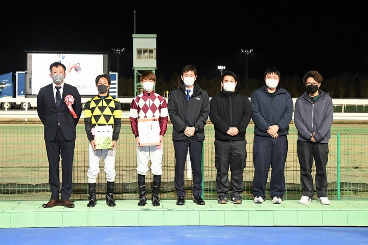 トータル26点を獲得した阪野 学騎手が見事 総合優勝となり、2位は23点を獲得した落合 玄太騎手、3位は21点を獲得した松井 伸也騎手でした。3名には、副賞としてみついし和牛と三石産グリーンアスパラが贈呈されました。