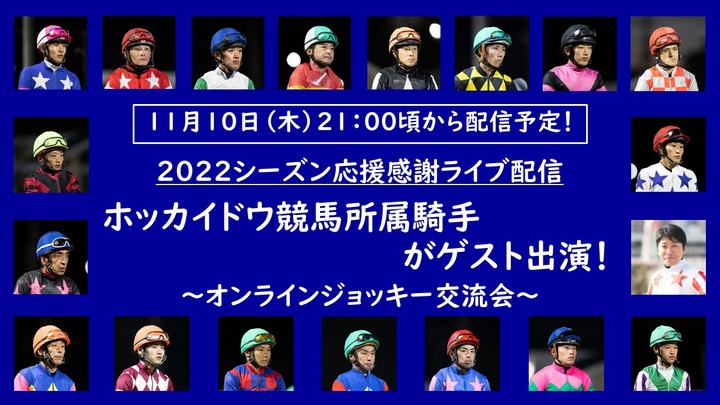 11月10日(木)、第65回道営記念終了後に「2022シーズン応援感謝ライブ配信~オンラインジョッキー交流会~」をYouTube「hokkaidokeiba」でライブ配信をします。