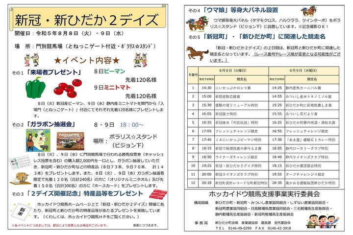 8月8日(火)・9日(水)門別競馬場において、以下のイベントを実施いたします。皆様のご来場お待ちしております。