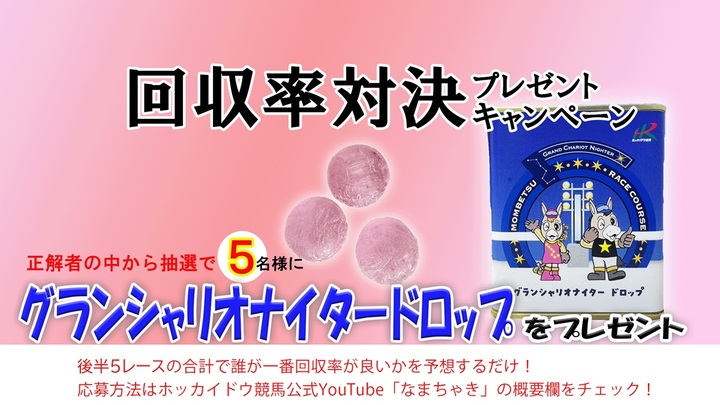 また、後半5レースの回収率対決を実施しております。視聴者の皆様には、誰が回収率で一番となるのか予想して頂き、的中者のなかから抽選で5名様に「グランシャリオナイタードロップ」をプレゼントしちゃいます。詳細については、それぞれの概要欄に応募URLが記載されておりますので、皆様のご投票をお待ちしております。
