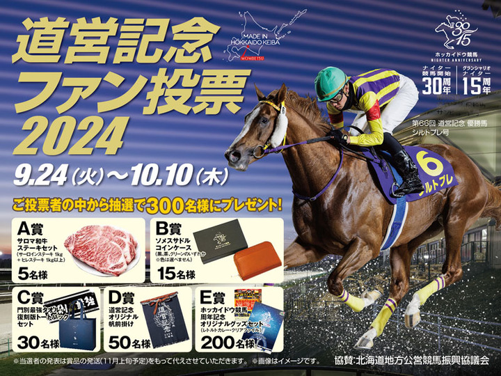 第67回道営記念(11月7日実施)の出走馬ファン投票を9月24日(火)より実施いたします。投票に参加された方の中から、抽選で合計300名様に以下の賞品をプレゼントいたしますので、たくさんのご応募をお待ちしております。